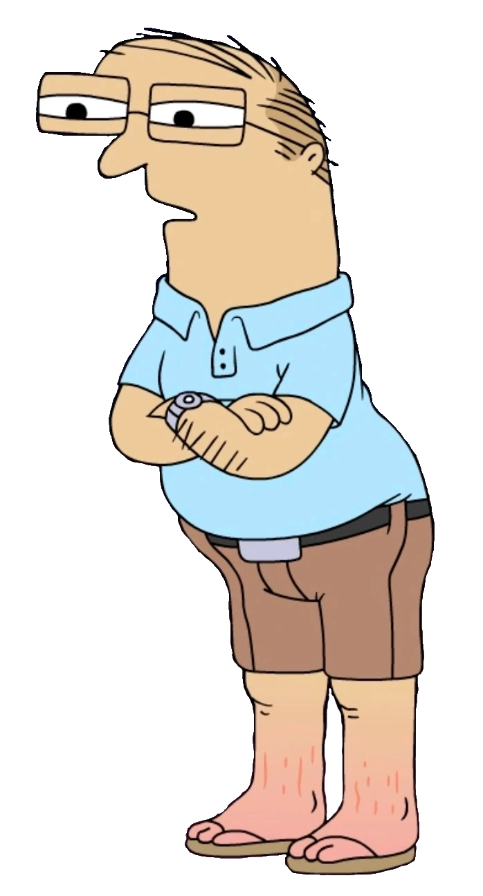 Bill has tan brown skin, glasses and thin hair, with a constantly tired expression on his face. His arms are also relatively hairy and his poor posture appears to be a result of lumbar lordosis. His choice of clothing is simple, consisting of a light blue polo shirt and brown shorts, as well as flip-flops and a watch.