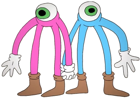 The Fun Twins appear identical, possessing one large eyeball with a green iris in the center of their body and having long, spindly limbs. They both wear white gloves and brown shoes. The only only difference between the two twins is that one is blue and the other pink.