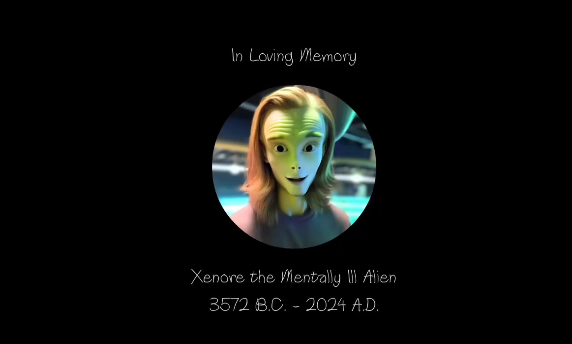 "Charlie, Pim, and Bill vs The Alien" | Xenore, the Mentally Ill Alien | 3572 B.C. - 2024 A.D. (age 5,595) | David Hootselle |