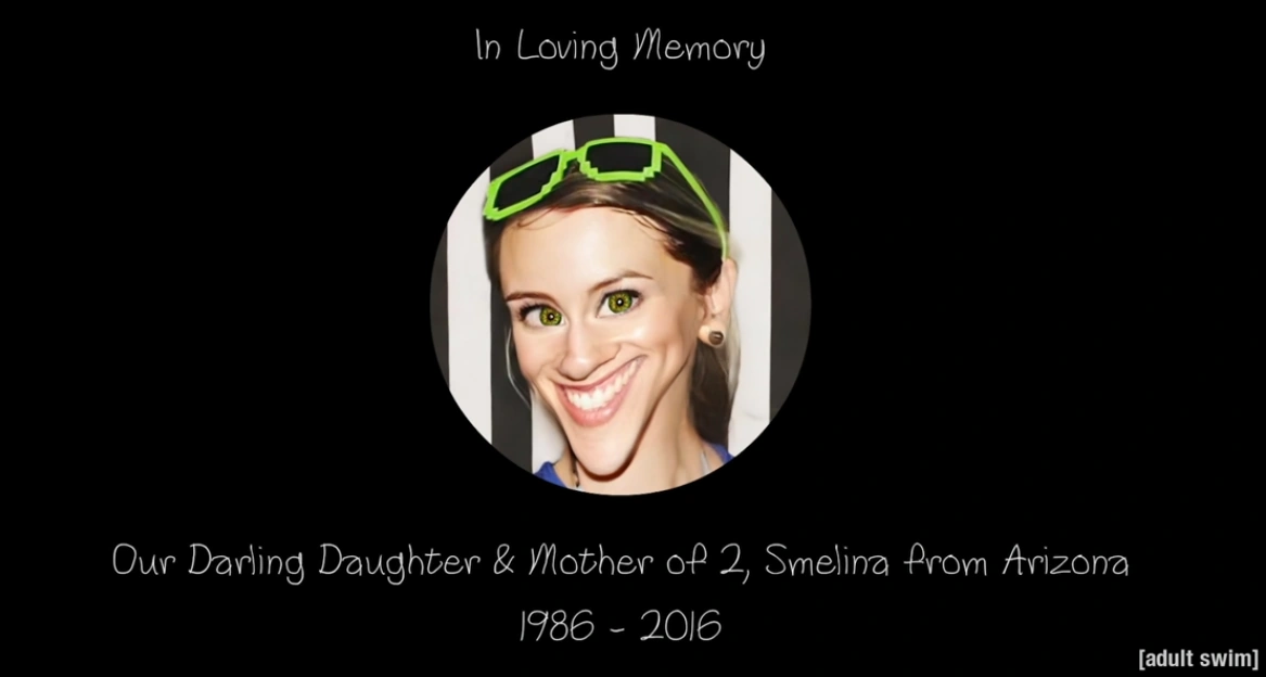 Each episode's "In Loving Memory" end card features a different person, with most episodes featuring a face that has been heavily photoshopped. Occasionally, the character featured will be one who was relevant to that episode's plot, with either the death being present in the episode (such as Simon S. Salty) or their death being the punchline of a gag (in the case of Smormu James Carter or Xenore). Occasionally the birth and death dates of the character will also be used as a gag.