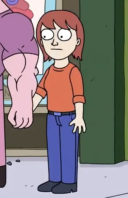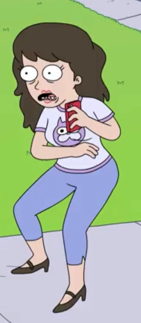 She is a big fan and supporter of Mr. Frog. She is seen running off the bus that Charlie was on, She then calls the police on Charlie (who was hallucinating from food poisoning), When Charlie walks up to her asking where the Smiling Friends Inc. building was, She runs away from him. |
