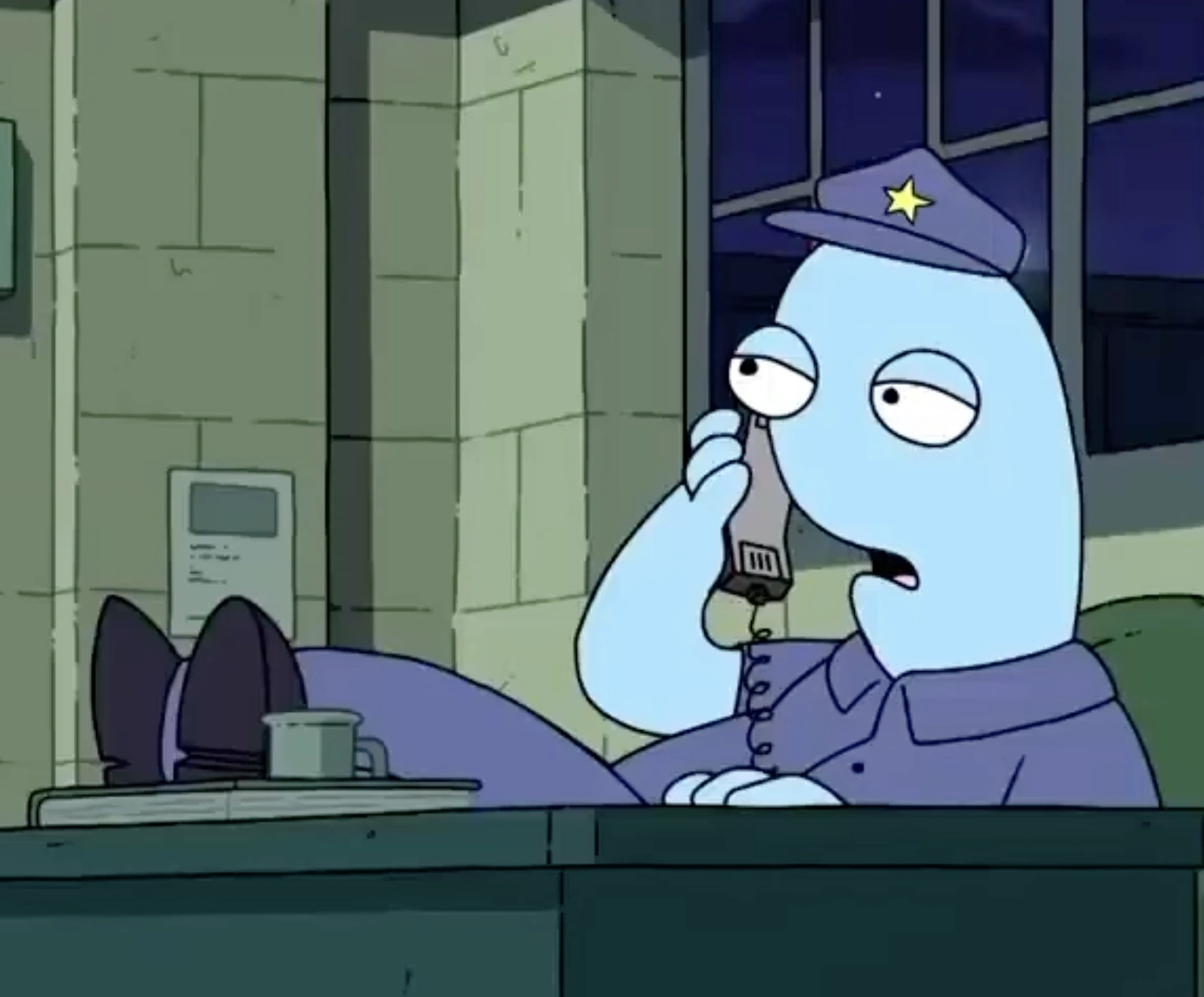 Orange cop | Unknown | Critter | "Mr. Frog" | It is an orange police officer wearing a navy uniform seen escorting a shaken but unharmed TMZ reporter who had been put in Mr. Frog's mouth for 7 agonizing minutes. |