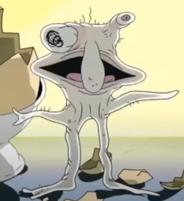 He is a green critter who takes a bite out of Shrimp when the latter comes out of the tanning bed. He also enjoys eating at The Flying Meepling restaurant. In "Pim Finally Turns Green", he bumps into the icebox containing Rotten the Snowman, knocking him over and indirectly killing him. His mannerisms are deliberately similar to Homer Simpson. He is voiced by Michael Cusack. |