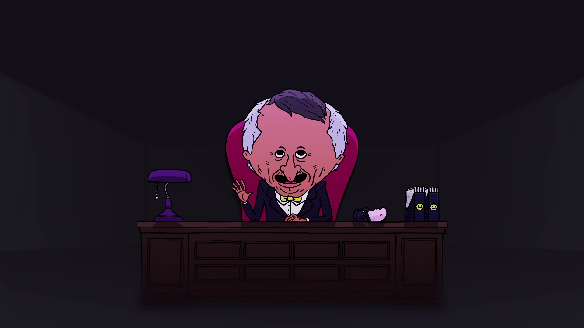 Mr. Boss' office is a black room which consists of a brown wooden desk with a large red chair behind it. A single door with a window on it saying "BOSS" leads in and out of the office. On the desktop, a purple lamp and two paper organizers can be seen. The organizer on the left has a frowny face while the one on the right has a smiley face.