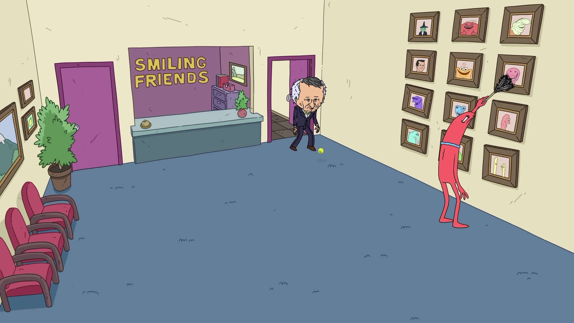 The reception room has grey carpeting with beige wallpaper. White ceiling tiles adorn the top of the room. During the Bliblie infestation, several of these tiles were dislodged, exposing dangling wires. Lining both sides of the room is an array of red chairs, one of which has a visible hole in the middle of it. At the back of the room is a reception desk with purple wallpaper. The company logo is displayed in bright yellow text behind it. Portraits of several human and critter characters, presumably previous clients, hang on the right side of the room. Two purple doors can be seen anchoring the reception desk, which lead to the other rooms in the office, the one on the right leads to the back of the building.