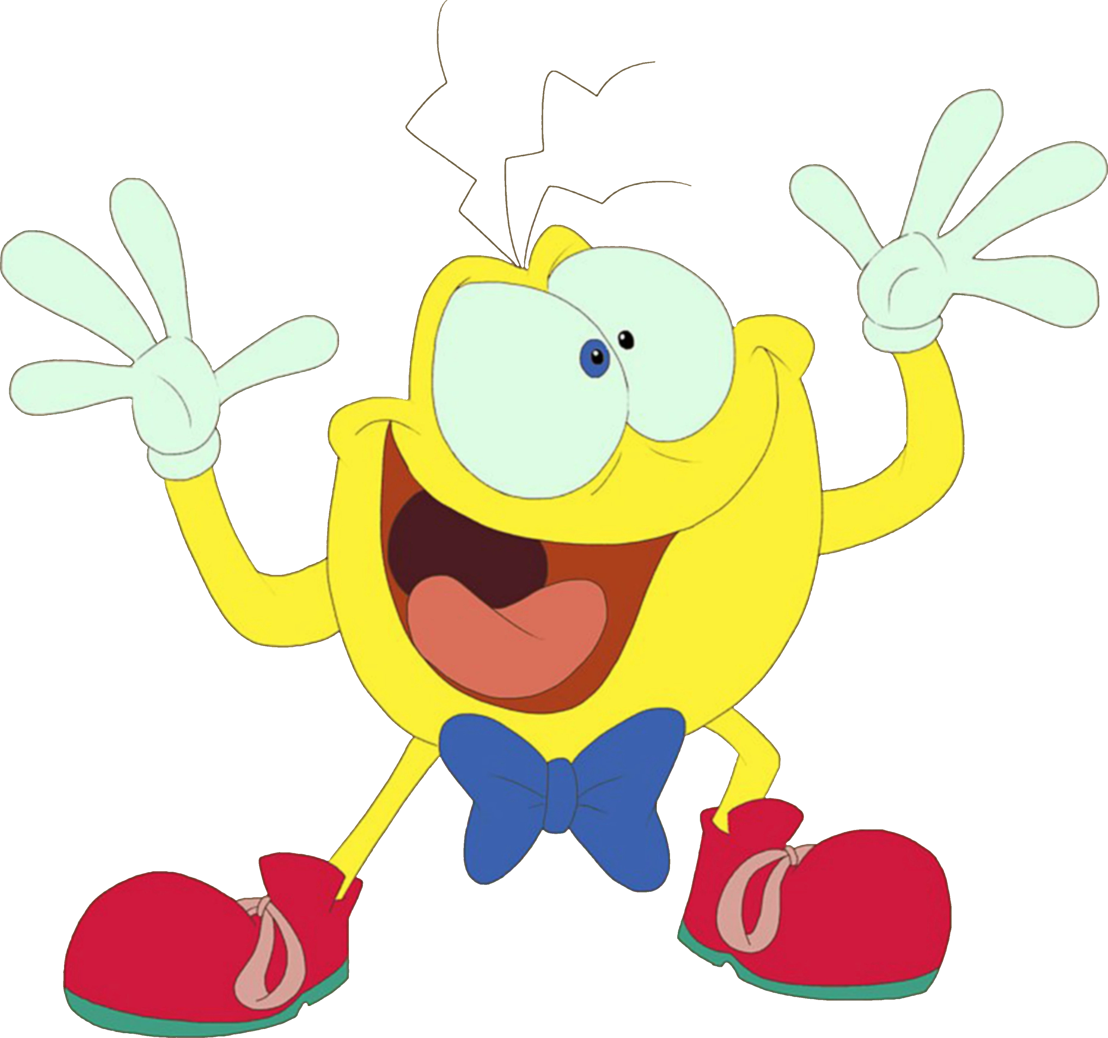 Squim appears to be a yellow ball with limbs attached to his body and three black strands of hair at the top of his head. He wears white rubber gloves on his hands, red buckled shoes with seafoam greens sole and a navy blue bowtie on his chest.As well a pair of blue eyes that makes neurotic facial expressions similar to the Eek from Eek! The Cat. He talks with a hyperactive and high-pitched British accent.