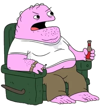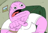 Steven is a pink, obese critter with patches of body hair on his arms and feet and stubble covering his face. He has several hairs unevenly growing out of his head and the back of his neck.