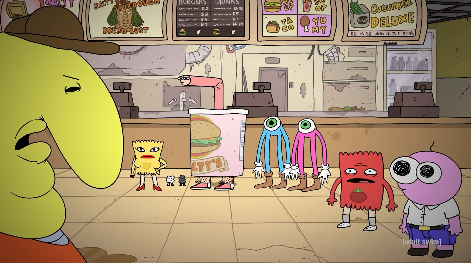 - In the episode Charlie Dies and Doesn't Come Back, Satan is shown ordering a burger and fries from Salty's, implying that the fast-food joint continued its operations after Simon S. Salty's death and reverted back to its old menu.